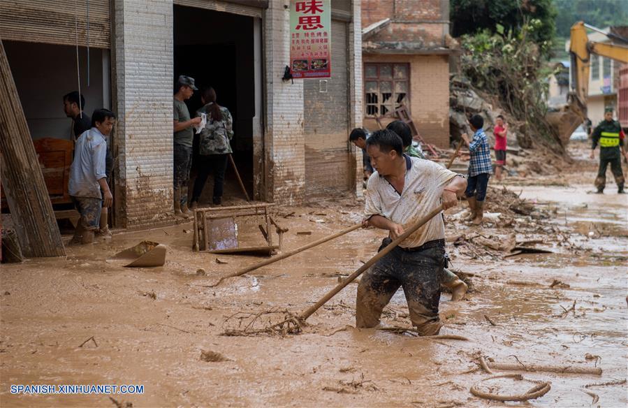 Personas limpian el lodo en el municipio de Mengdong golpeado por inundaciones, en el condado Malipo de la Prefectura Autónoma Zhuang y Miao de Wenshan, provincia de Yunnan, en el suroeste de China, el 3 de septiembre de 2018. Las fuertes lluvias que golpearon el municipio de Mengdong el domingo provocaron inundaciones y deslaves, que dejaron cinco personas muertas y otras 15 desaparecidas. (Xinhua/Hu Chao)