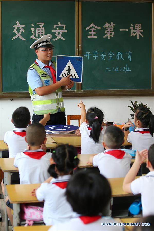 ANHUI, septiembre 3, 2018 (Xinhua) -- Estudiantes aprenden conocimientos de seguridad vial en una escuela en Huangshan, provincia de Anhui, en el este de China, el 3 de septiembre de 2018. Escuelas alrededor del país preparan varias actividades para que los estudiantes reciban el nuevo semestre. (Xinhua/Shi Yalei)