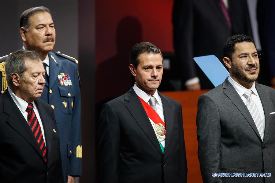 El presidente de México, Enrique Pe?a Nieto (c), acompa?ado por el presidente del Senado, Martí Batres (d) y el presidente de la Cámara de Diputados, Porfirio Mu?oz Ledo (i-frente), participa durante un mensaje a la nación con motivo de su Sexto Informe de Gobierno, el último de su administración, celebrado en Palacio Nacional, en la Ciudad de México, capital de México, el 3 de septiembre de 2018. (Xinhua/Francisco Ca?edo)