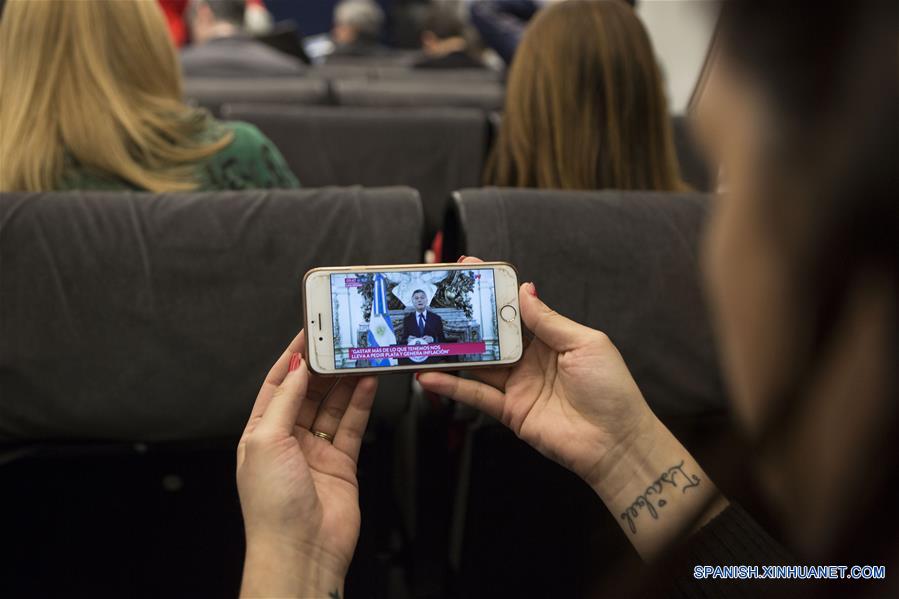 Una periodista observa en su dispositivo móvil la transmisión del anuncio grabado del presidente argentino Mauricio Macri, mientras espera a que inicie la conferencia del ministro argentino de Hacienda, Nicolás Dujovne, en la sede del Ministerio de Hacienda, en Buenos Aires, capital de Argentina, el 3 de septiembre de 2018. El presidente de Argentina, Mauricio Macri, anunció el lunes una reducción en el número de ministerios que integran el poder Ejecutivo, como se?al de austeridad tras una semana de volatilidad en los mercados financieros y la devaluación del peso frente al dólar. (Xinhua/Martín Zabala)