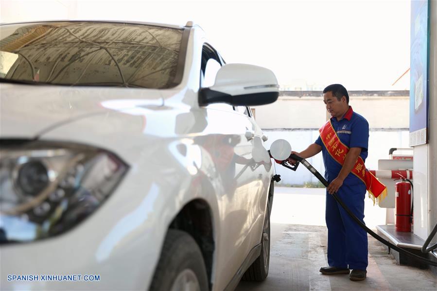 Un empleado llena de combustible un vehículo en una estación de abastecimiento en el condado de Renxian, provincia de Hebei, en el norte de China, el 3 de septiembre de 2018. China subirá los precios minoristas de la gasolina y el diesel a partir del martes, de acuerdo con la Comisión de Desarrollo Nacional y Reformas. Los precios minoristas subirán a 180 yuanes (alrededor de 26.4 dólares estadounidenses) por tonelada de gasolina y 170 yuanes para el diesel. (Xinhua/Song Jie)