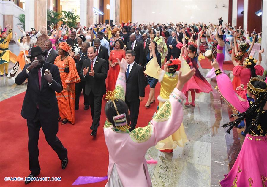 BEIJING, septiembre 3, 2018 (Xinhua) -- Líderes extranjeros y sus cónyuges que asisten a la Cumbre de Beijing 2018 del Foro de Cooperación China-Africa (FOCAC, por sus siglas en inglés) son recibidos por jóvenes artistas en su camino al banquete de bienvenida ofrecido por el presidente de China, Xi Jinping y su esposa Peng Liyuan en el Gran Palacio del Pueblo en Beijing, capital de China, el 3 de septiembre de 2018. (Xinhua/Shen Hong)