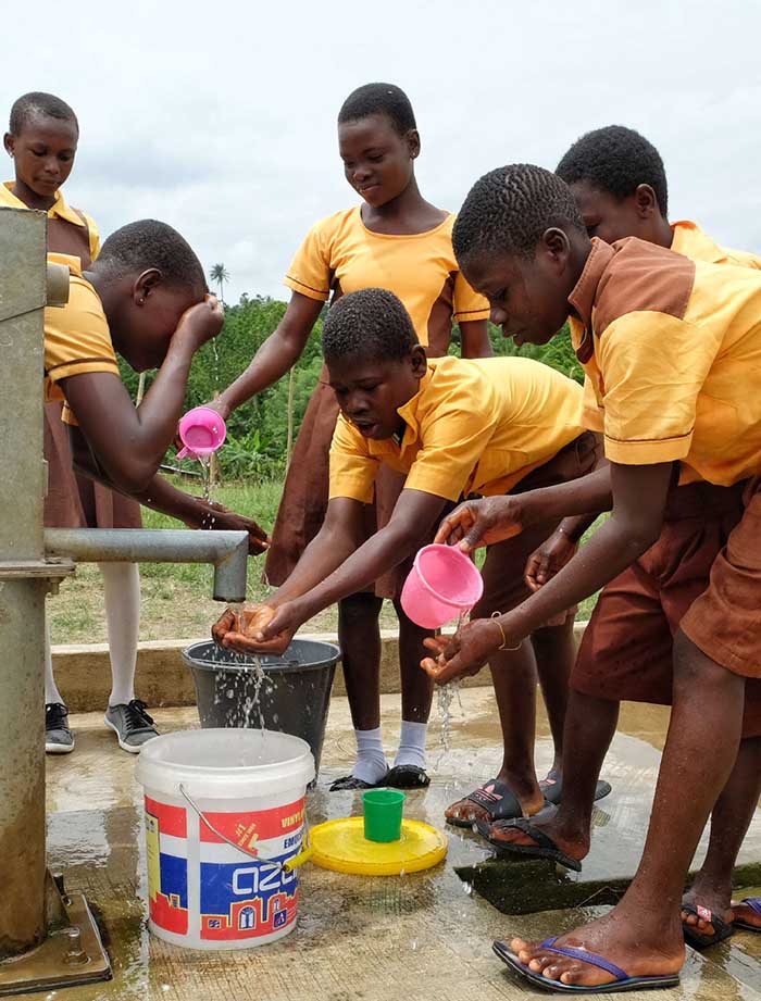 Los ni?os recogen agua de un pozo en la aldea de Guayotse, Ghana, en junio. El gobierno chino proporciona 1.000 pozos a cientos de comunidades rurales en seis de las 10 regiones del país africano para llevar agua potable a la población local. [Foto / Xinhua]
