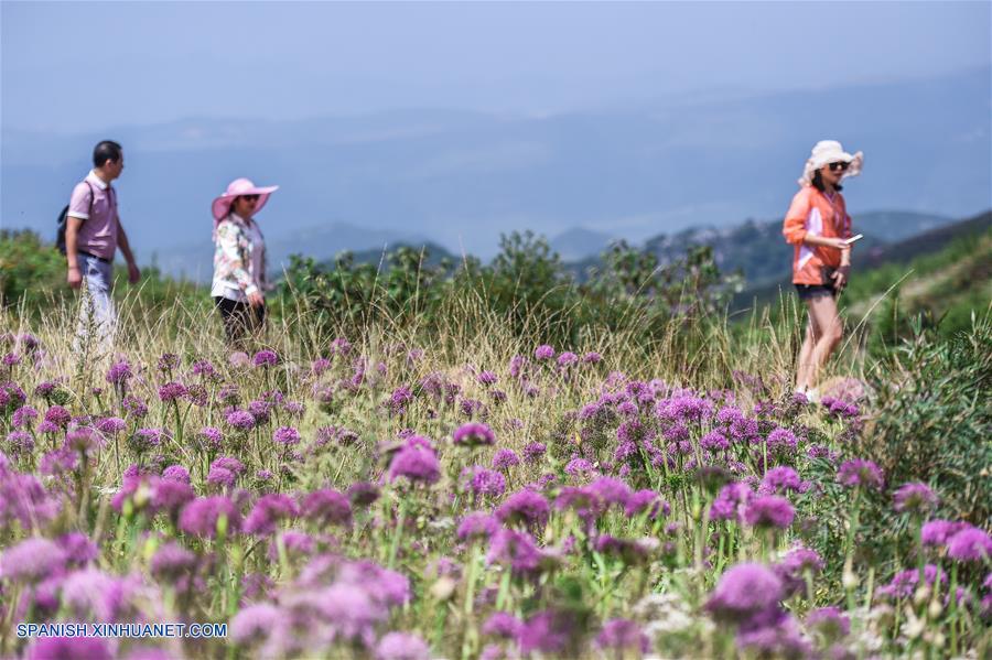 GUIZHOU, septiembre 5, 2018 (Xinhua) -- Turistas observan las flores de cebollino silvestre en un punto escénico, en Liupanshui, provincia de Guizhou, en el suroeste de China, el 5 de septiembre de 2018. (Xinhua/Tao Liang)