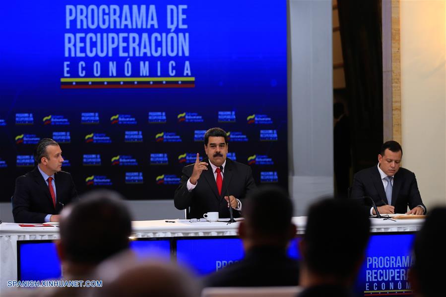 CARACAS, septiembre 5, 2018 (Xinhua) -- Imagen cedida por la Presidencia de Venezuela del presidente venezolano, Nicolás Maduro (c), reuniéndose con miembros del sector empresarial, en el Palacio de Miraflores, en Caracas, Venezuela, el 5 de septiembre del 2018. El gobierno venezolano entregó el miércoles a empresarios del sector productivo de ese país créditos por 9.072 millones de bolívares soberanos, lo que equivale a más de 151 millones de dólares estadounidenses. (Xinhua/Presidencia de Venezuela)