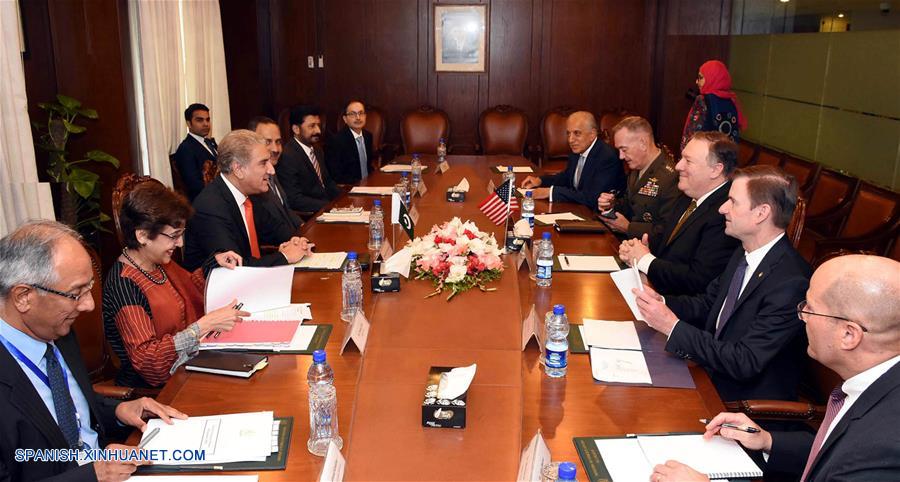 Imagen publicada por el Departamento de Información de Prensa (PID, por sus siglas en inglés) de Pakistán, del ministro de Relaciones Exteriores de Pakistán, Shah Mahmood Qureshi (3-i-frente), participando en una reunión con el secretario de Estado estadounidense, Mike Pompeo (3-d-frente) en Islamabad, capital de Pakistán, el 5 de septiembre de 2018. El secretario de Estado de Estados Unidos, Mike Pompeo, y su homólogo pakistaní, Shah Mahmood Qureshi, pidieron el miércoles la solución política del asunto afgano, indicó la cancillería pakistaní. Las dos partes también coincidieron en que "las condiciones actuales en Afganistán exigen redoblar los esfuerzos por una solución política". (Xinhua/PID)