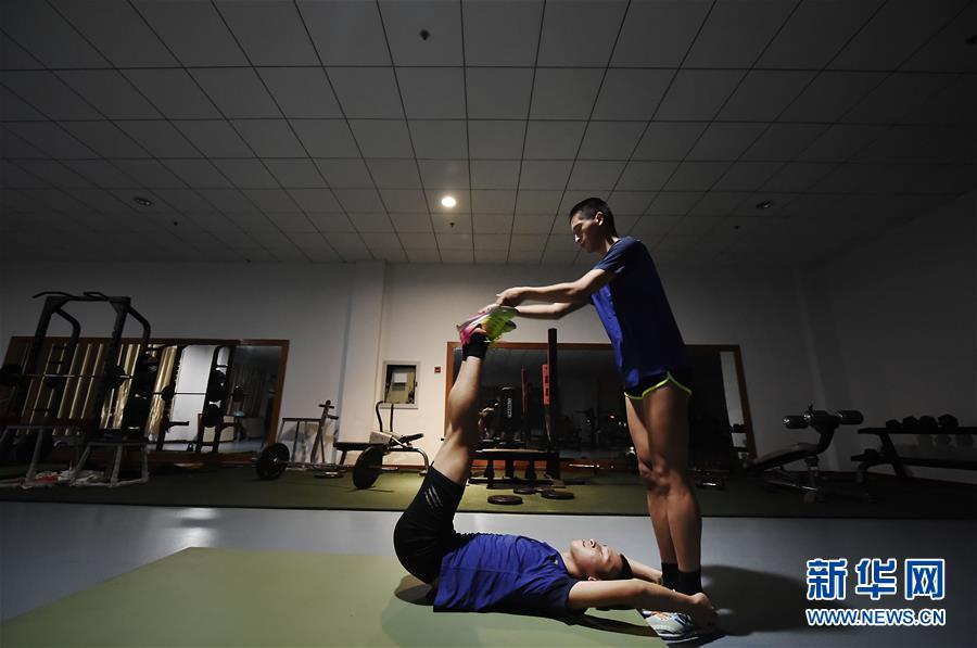La imagen muestra a los dos hermanos realizando entrenamiento de fuerza por la noche en la sala de entrenamiento interior (foto del 15 de agosto). Agencia de Noticias Xinhua, reportero Li Yuze.