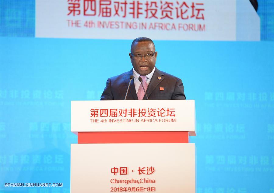 HUNAN, septiembre 6, 2018 (Xinhua) -- El presidente de Sierra Leona, Julius Maada Bio, pronuncia un discurso durante el 4 Foro Inversión en Africa, en Changsha, provincia de Hunan, en el centro de China, el 6 de septiembre de 2018. (Xinhua/Chen Yuxiao)