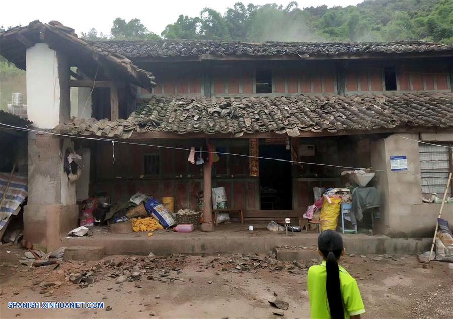 YUNNAN, septiembre 8, 2018 (Xinhua) -- Imagen tomada con un teléfono celular de una vista de la situación de una vivienda luego del sismo, en la villa de Bingbang del municipio de Tongguan en el Condado Autónomo Hani de Mojiang, provincia de Yunnan, en el suroeste de China, el 8 de septiembre de 2018. Un sismo de magnitud 5,9 sacudió el distrito autónomo de la etnia hani de Mojiang en la provincia suroccidental china de Yunnan, a las 10:31 del sábado (hora de Beijing), infomó el Centro de Redes Sismológicas de China. (Xinhua/Str)