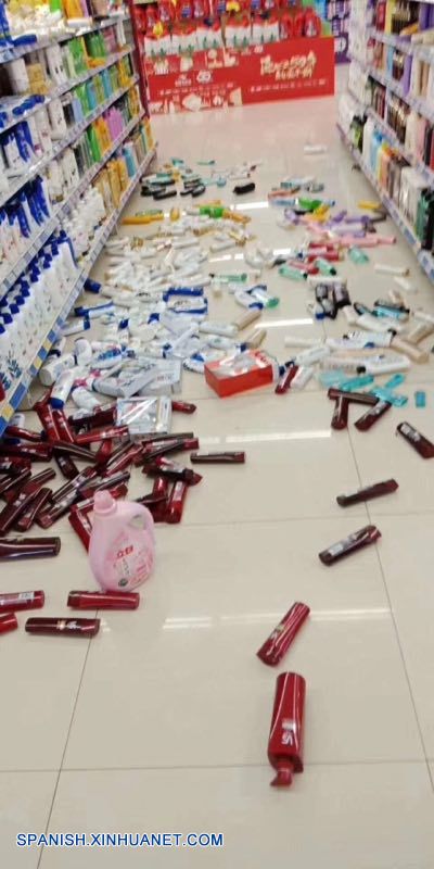 YUNNAN, septiembre 8, 2018 (Xinhua) -- Artículos caen de los anaqueles en un supermercado, en el Condado Autónomo Hani de Mojiang, provincia de Yunnan, en el suroeste de China, el 8 de septiembre de 2018. Un sismo de magnitud 5,9 sacudió el distrito autónomo de la etnia hani de Mojiang en la provincia suroccidental china de Yunnan, a las 10:31 del sábado (hora de Beijing), infomó el Centro de Redes Sismológicas de China. (Xinhua/Str)