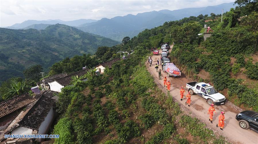 YUNNAN, septiembre 8, 2018 (Xinhua) -- Rescatistas trabajan en el municipio de Tongguan del Condado Autónomo Hani de Mojiang, provincia de Yunnan, en el suroeste de China, el 8 de septiembre de 2018. Catorce personas sufrieron heridas leves como consecuencia de un sismo que sacudió el distrito autónomo de la etnia hani de Mojiang en la provincia suroccidental china de Yunnan, a las 10:31 del sábado (hora de Beijing), informaron las autoridades locales. Equipos profesionales de rescate equipados con sensores para ubicar persanas sepultadas, cámaras térmicas y excavadoras, así como perros rastreadores, también fueron enviados a la zona afectada. (Xinhua/Zhou Lei)