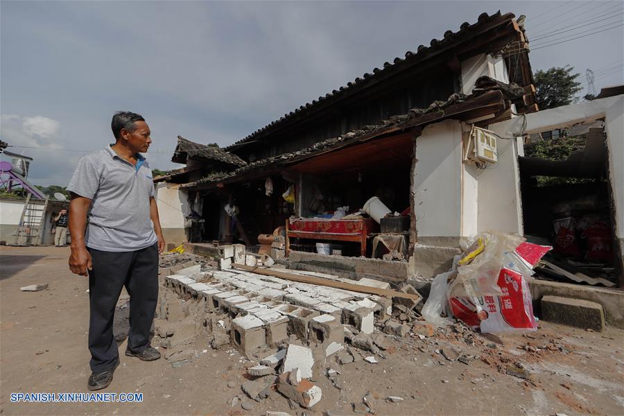 YUNNAN, septiembre 8, 2018 (Xinhua) -- Un residente camina frente a su vivienda da?ada en el municipio de Tongguan del Condado Autónomo Hani de Mojiang, provincia de Yunnan, en el suroeste de China, el 8 de septiembre de 2018. Catorce personas sufrieron heridas leves como consecuencia de un sismo que sacudió el distrito autónomo de la etnia hani de Mojiang en la provincia suroccidental china de Yunnan, a las 10:31 del sábado (hora de Beijing), informaron las autoridades locales. Equipos profesionales de rescate equipados con sensores para ubicar persanas sepultadas, cámaras térmicas y excavadoras, así como perros rastreadores, también fueron enviados a la zona afectada. (Xinhua/Zhou Lei)