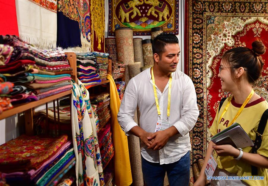 Un expositor de India muestra mascadas a una visitante en la 20 Feria Internacional de Inversión y Comercio de China, en Xiamen, provincia de Fujian, en el sureste de China, el 8 de septiembre de 2018. (Xinhua/Wei Peiquan)