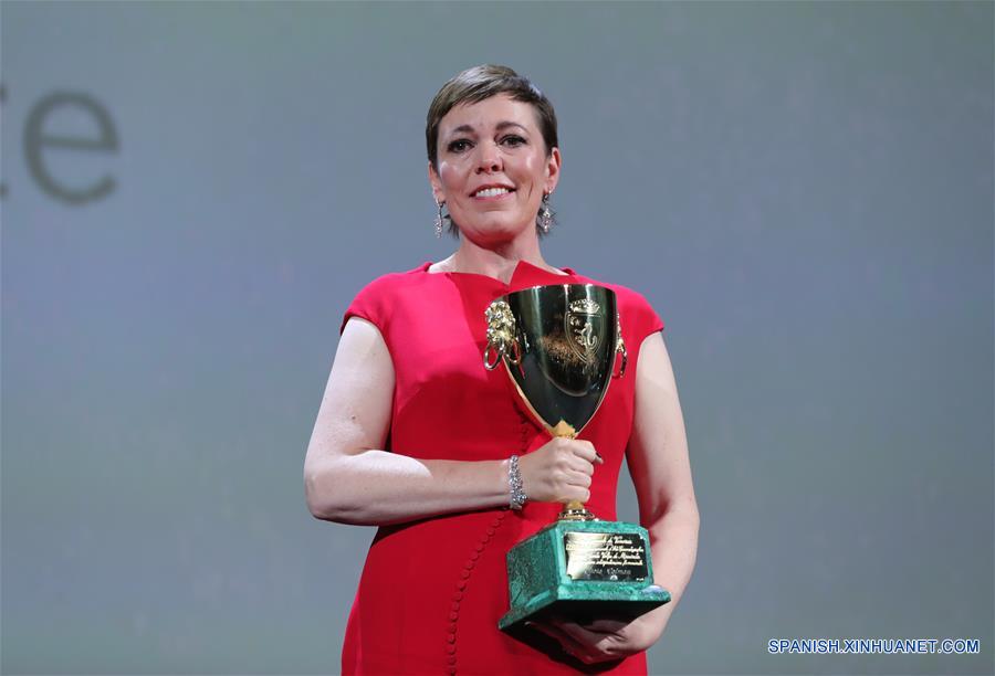 La actriz británica, Olivia Colman, muestra su premio a Mejor Actriz por su desempe?o en la película "La Favorita" en el 75 Festival Internacional de Cine de Venecia, en Venecia, Italia, el 8 de septiembre de 2018. (Xinhua/Cheng Tingting)