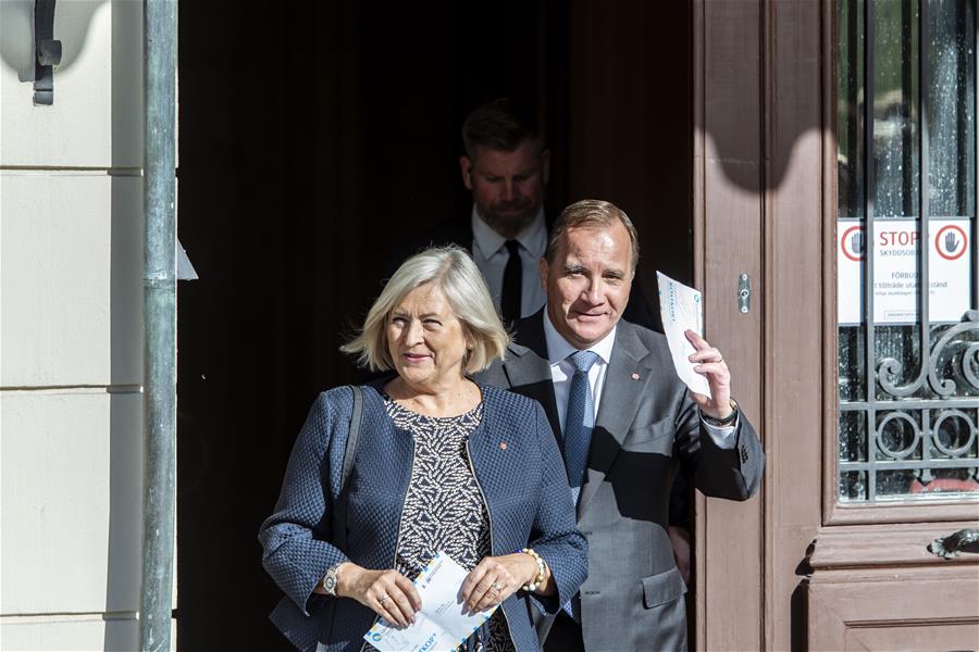 El primer ministro de Suecia, Stefan Lofven (d), acompa?ado de su esposa, Ulla Lofven (i), sale de la Casa del Primer Ministro para emitir su voto, en Estocolmo, Suecia, el 9 de septiembre de 2018. De acuerdo con información de la prensa local, los centros de votación abrieron el domingo por la ma?ana en Suecia mientras el país se dirige a una elección que parece inclinarse a convertir al partido nacionalista sueco Partido Demócrata en el dirigente político. (Xinhua/Shi Tiansheng)