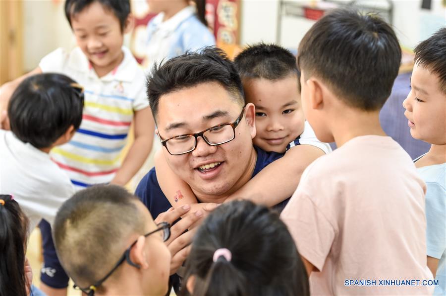 Imagen del 4 de septiembre de 2018 del maestro Guo Xinwang divirtiéndose con ni?os, en el Jardín de Ni?os Xiaoxihu, en Nanjing, capital de la provincia de Jiangsu, en el este de China. Guo, nacido en 1993 y graduado de la Universidad Normal de Jiangsu, se convirtió en el primer y único maestro masculino del Jardín de Ni?os Xiaoxihu hace tres a?os. Hay más de 400 educadores masculinos en Nanjing actualmente, más de tres por ciento del total de maestros que trabajan en jardines de ni?os. (Xinhua/Li Bo)