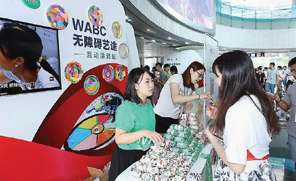 Una empleada de Tencent explica a un visitante cómo participar en el programa de recaudación de fondos para obras sociales. [Foto: proporcionada]