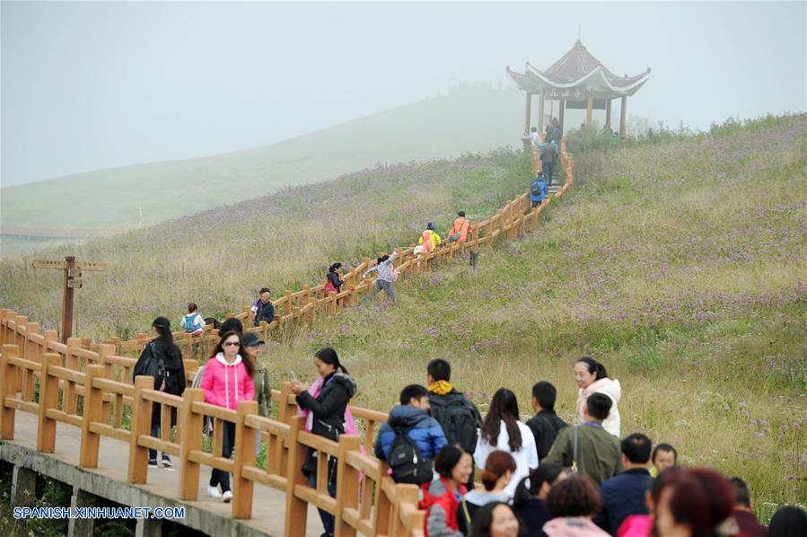 GUIZHOU, septiembre 10, 2018 (Xinhua) -- Imagen del 9 de septiembre de 2018 de turistas observando flores silvestres de cebollino, en el área escénica de Dajiucaiping, en el condado de Hezhang, provincia de Guizhou, en el suroeste de China. (Xinhua/Yang Wenbin)