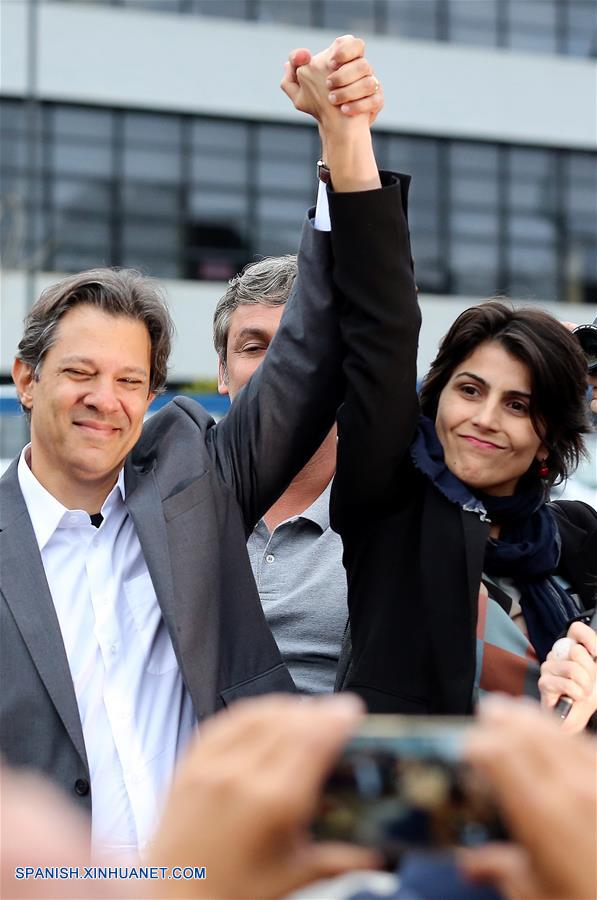 CURITIBA, septiembre 11, 2018 (Xinhua) -- El ex alcalde de Sao Paulo, Fernando Haddad (i), en compa?ía de la ex diputada del Partido Comunista de Brasil (PCdoB) y candidata a la vicepresidencia, Manuela D'Avila (d), reacciona durante un acto político para el lanzamiento de su candidatura a la Presidencia brasile?a por el Partido de los Trabajadores (PT) de Brasil, en reemplazo del ex presidente Luiz Inácio Lula da Silva, frente a la Superintendencia de la Policía Federal, en Curitiba, Brasil, el 11 de septiembre de 2018. El Partido de los Trabajadores (PT) de Brasil aprobó el martes al ex alcalde de Sao Paulo, Fernando Haddad, como nuevo candidato a la Presidencia en reemplazo del ex presidente Luiz Inácio Lula da Silva, cuya candidatura fue impugnada por la Justicia Electoral con base en la Ley de la Ficha Limpia. (Xinhua/Giuliano Gomes/PR PRESS/AGENCIA ESTADO)
