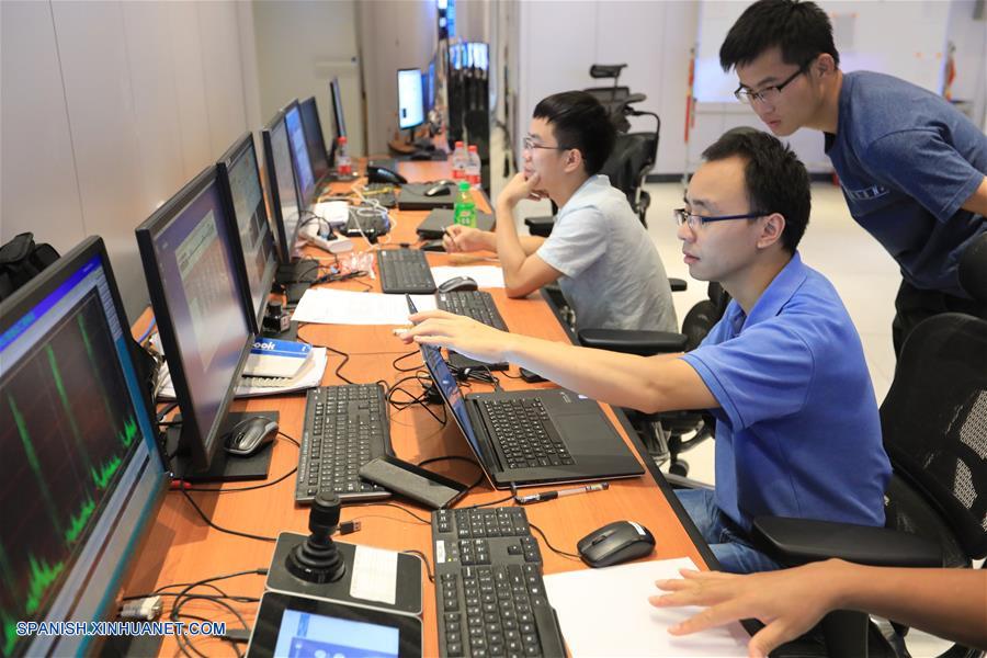 GUIZHOU, septiembre 11, 2018 (Xinhua) -- Imagen del 10 de septiembre de 2018 de empleados trabajando en un centro de control del Telescopio de Apertura Esférica de 500 metros de China (FAST, por sus siglas en inglés), en la provincia de Guizhou, en el suroeste de China. El FAST ha descubierto 44 nuevos púlsares hasta ahora. (Xinhua/Ou Dongqu)