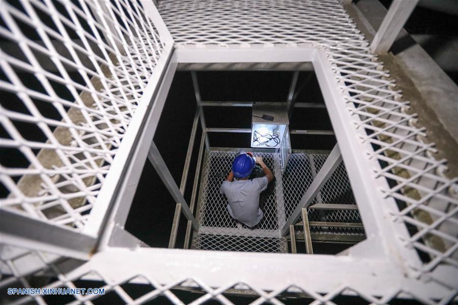 GUIZHOU, septiembre 11, 2018 (Xinhua) -- Un empleado trabaja del Telescopio de Apertura Esférica de 500 metros de China (FAST, por sus siglas en inglés), en la provincia de Guizhou, en el suroeste de China, el 11 de septiembre de 2018. El FAST ha descubierto 44 nuevos púlsares hasta ahora. (Xinhua/Liu Xu)