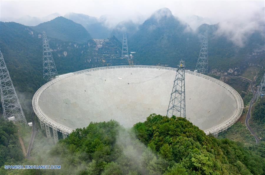 GUIZHOU, septiembre 11, 2018 (Xinhua) -- Vista del Telescopio de Apertura Esférica de 500 metros de China (FAST, por sus siglas en inglés), en la provincia de Guizhou, en el suroeste de China, el 11 de septiembre de 2018. El FAST ha descubierto 44 nuevos púlsares hasta ahora. (Xinhua/Ou Dongqu)