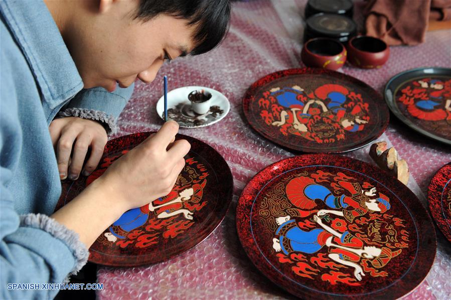 GUIZHOU, septiembre 11, 2018 (Xinhua) -- Imagen del 10 de septiembre de 2018 del heredero Gao Yan elaborando un trabajo de laca, en el condado de Dafang, provincia de Guizhou, en el suroeste de China. El trabajo de laca producido en el condado de Dafang es hecho a mano a través de todos los procedimientos y requiere altos estándares. La técnica de fabricación sólo puede obtenerse de un artesano experimentado. Hoy en día, el gobierno local ha establecido estudios e introducido la artesanía en las tiendas en línea para la herencia del arte. (Xinhua/Yang Wenbin)