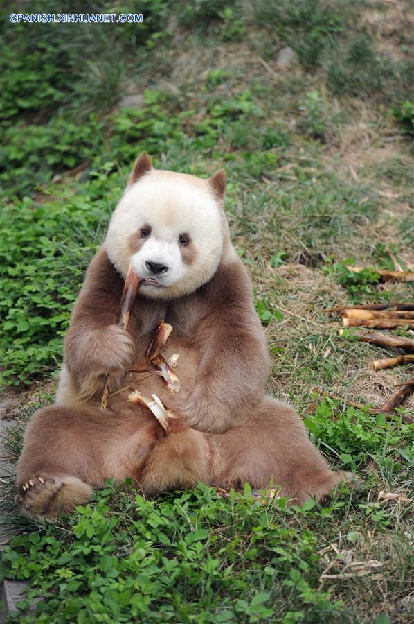 SHAANXI, septiembre 11, 2018 (Xinhua) -- Imagen del 7 de septiembre de 2018 de Qizai, un raro panda marrón y blanco, alimentándose con brotes de bambú en el centro de investigación y recuperación de animales salvajes raros de Shaanxi, en Xi'an, provincia de Shaanxi, en el noroeste de China. Qizai pertenece a una subespecie que son más comúnmente conocidos como pandas de Qinling en referencia a las aisladas Monta?as Qinling donde han sido vistos. (Xinhua/Zhang Bowen)