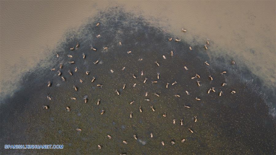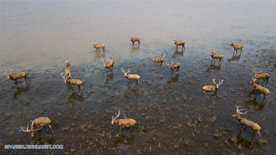 HUBEI, septiembre 12, 2018 (Xinhua) -- Imagen del 11 de septiembre de 2018 de una vista aérea de una manada de wapitíes en la Reserva Nacional de Naturaleza para Wapitíes de Shishou, en la ciudad de Shishou, provincia de Hubei, en el centro de China. (Xinhua/Jin Liwang)