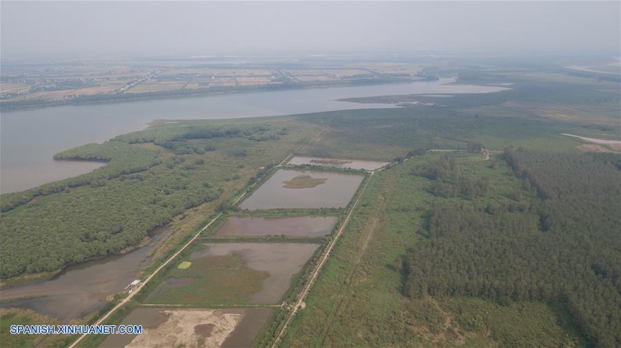 HUBEI, septiembre 12, 2018 (Xinhua) -- Imagen del 11 de septiembre de 2018 de una vista aérea de la Reserva Nacional de Naturaleza para Wapitíes de Shishou, en la ciudad de Shishou, provincia de Hubei, en el centro de China. (Xinhua/Jin Liwang)