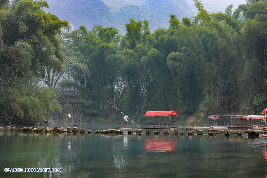 GUIZHOU, septiembre 12, 2018 (Xinhua) -- Un hombre rema a bordo de una balsa de bambú en el punto escénico de Daxiaojing, en el condado de Luodian, provincia de Guizhou, en el suroeste de China, el 12 de septiembre de 2018. (Xinhua/Liu Xu)