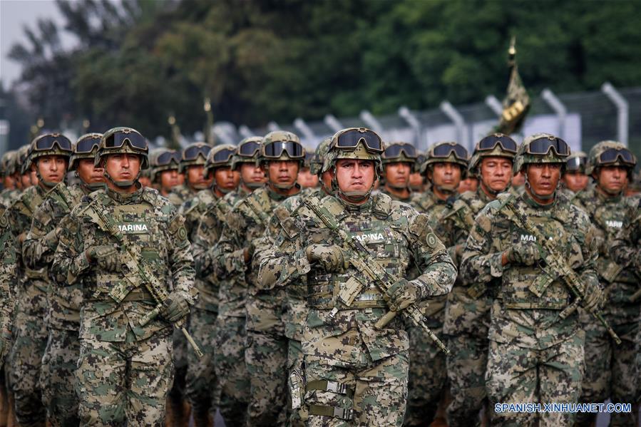 Integrantes de la Marina-Armada de México participan durante el pase de revista del Contingente Naval que participará en el Desfile Cívico Militar por el 208 Aniversario del Inicio de la Guerra de Independencia de México, en la Ciudad de México, capital de México, el 12 de septiembre de 2018. (Xinhua/Francisco Ca?edo)