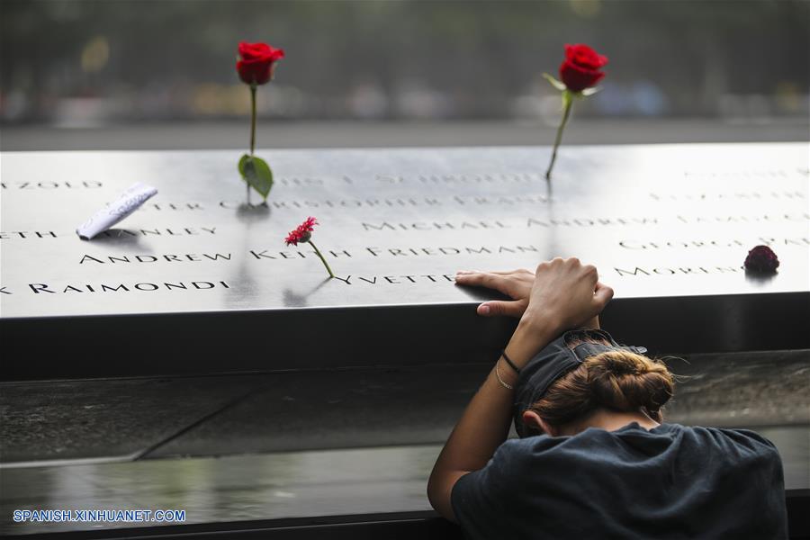NUEVA YORK, septiembre 11, 2018 (Xinhua) -- Personas rinden homenaje en las placas donde fueron inscritos los nombres de las víctimas de los ataques del 11 de septiembre, alrededor de la Piscina Sur del Monumento Conmemorativo y Museo Nacional del 11 de septiembre, en Nueva York, Estados Unidos, el 11 de septiembre de 2018. Con motivo del 17 aniversario de los ataques del 11 de septiembre el martes se realizaron ceremonias conmemorativas en Nueva York, Washington D.C. y Pensilvania. En Nueva York, la ceremonia se realizó en el Monumento Conmemorativo y Museo Nacional del 11 de septiembre ubicado en el sitio en el que alguna vez se ubicaron las Torres Gemelas del Centro Mundial de Comercio. (Xinhua/Wang Ying)