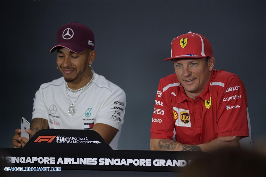 SINGAPUR, septiembre 13, 2018 (Xinhua) -- Lewis Hamilton (i) de la escudería Mercedes, y Kimi Raikkonen (d), de la escudería Ferrari, asisten a la conferencia de prensa previa a la Carrera Nocturna del Gran Premio de Singapur de Fórmula 1, en Singapur, capital de Singapur, el 13 de septiembre de 2018. (Xinhua/Then Chih Wey)