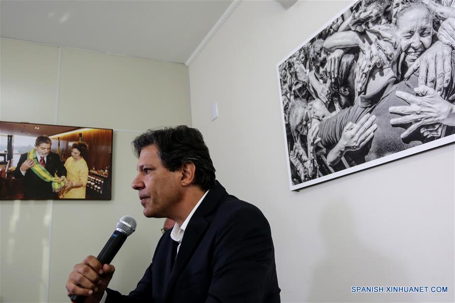 SAO PAULO, septiembre 13, 2018 (Xinhua) -- El candidato a la Presidencia de Brasil del Partido de los Trabajadores (PT), Fernando Haddad, participa durante una conferencia de prensa, en Sao Paulo, Brasil, el 13 de septiembre de 2018. Dos días después del lanzamiento oficial de su candidatura, Fernando Haddad, presidenciable del PT de Brasil, lidera los sondeos de intención de voto con 22 por ciento, según la encuesta divulgada el jueves por el instituto Vox Populi, encargada por la Central Unica de Trabajadores (CUT). (Xinhua/Rahel Patrasso)
