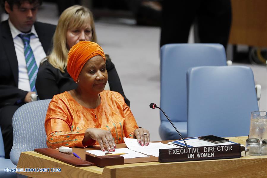 La directora ejecutiva de ONU Mujeres, Phumzile Mlambo-Ngcuka, participa durante una reunión del Consejo de Seguridad de la Organización de las Naciones Unidas (ONU), sobre la situación en Somalia, en la sede de la ONU, en Nueva York, Estados Unidos, el 13 de septiembre de 2018. (Xinhua/Li Muzi)
