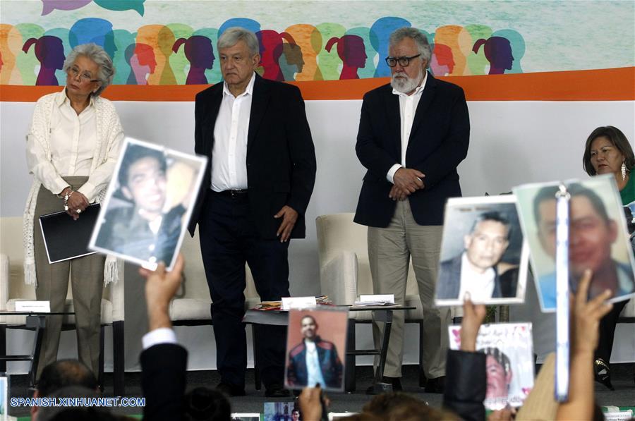 El presidente electo de México, Andrés Manuel López Obrador (2-i), junto a la próxima secretaria de Gobernación, Olga Sánchez Cordero (i), y el próximo subsecretario de Derechos Humanos, Población y Migración de la Secretaría de Gobernación, Alejandro Encinas (2-d), participa en el Segundo Diálogo por la Paz, la Verdad y la Justicia, en el Centro Cultural Universitario Tlatelolco, en la Ciudad de México, capital de México, el 14 de septiembre de 2018. Luego de escuchar reclamos de familiares de personas desaparecidas, el presidente electo de México, Andrés Manuel López Obrador, se?aló que pedirá perdón a víctimas de la violencia haciendo un llamado a la unidad para juntos sacar al país de "esta tremenda tragedia". Entre demandas de justicia de familiares de personas desaparecidas, el Movimiento por la Paz con Justicia y Dignidad (MPJD), encabezado por el activista Javier Sicilia, pidió la localización y entrega de sus familiares desaparecidos, de acuerdo con información de la prensa local. (Xinhua/Ricardo Aldayturriaga)