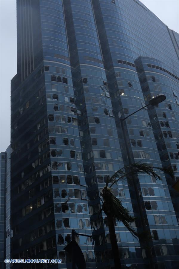 HONG KONG, septiembre 16, 2018 (Xinhua) -- Vista de ventanas rotas en un edificio en Hong Kong, en el sur de China, el 16 de septiembre de 2018. La se?al de huracán No. 10, el nivel más alto de alerta, fue emitida por el Observatorio de Hong Kong a las 9:40 hora local del domingo y fue sustituida por la segunda alerta más alta, la se?al de Vendaval del Sudeste 8, a las 19:40 hora local. (Xinhua/Wang Shen)
