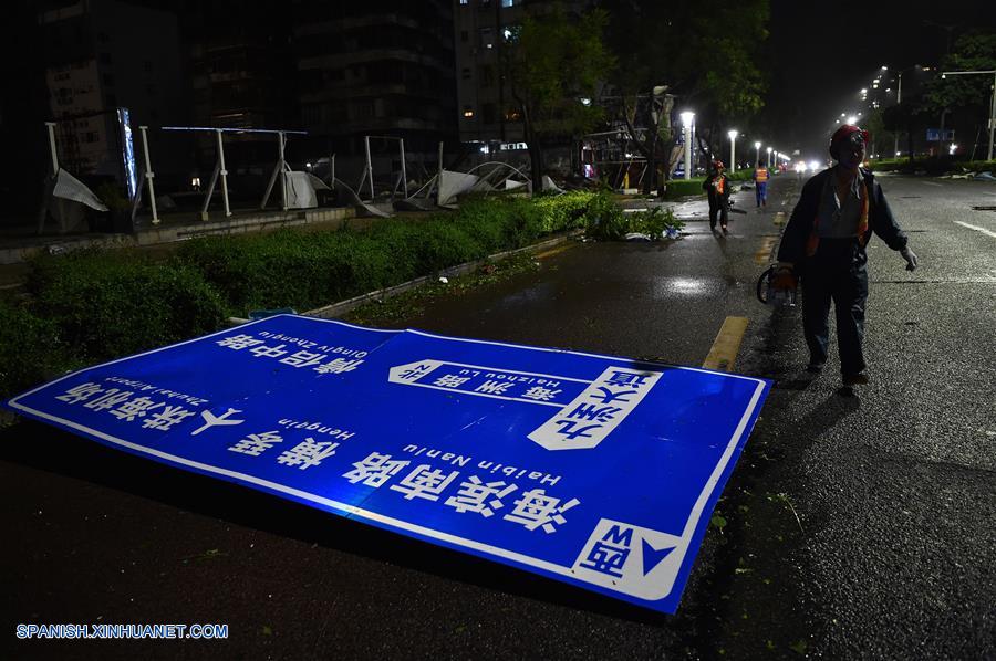 GUANGDONG, septiembre 16, 2018 (Xinhua) -- Una se?alización permanece en el suelo en Zhuhai, provincia de Guangdong, en el sur de China, el 16 de septiembre de 2018. El tifón Mangkhut aterrizó a las 17:00 del domingo en la costa de la ciudad de Jiangmen, en la provincia de Guangdong, sur de China, con vientos de hasta 162 kilómetros por hora, según la estación meteorológica provincial. (Xinhua/Liang Xu)