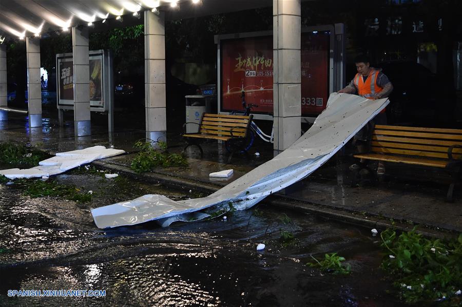 GUANGDONG, septiembre 16, 2018 (Xinhua) -- Un trabajador recoge los restos de un letrero en Zhuhai, provincia de Guangdong, en el sur de China, el 16 de septiembre de 2018. El tifón Mangkhut aterrizó a las 17:00 del domingo en la costa de la ciudad de Jiangmen, en la provincia de Guangdong, sur de China, con vientos de hasta 162 kilómetros por hora, según la estación meteorológica provincial. (Xinhua/Liang Xu)