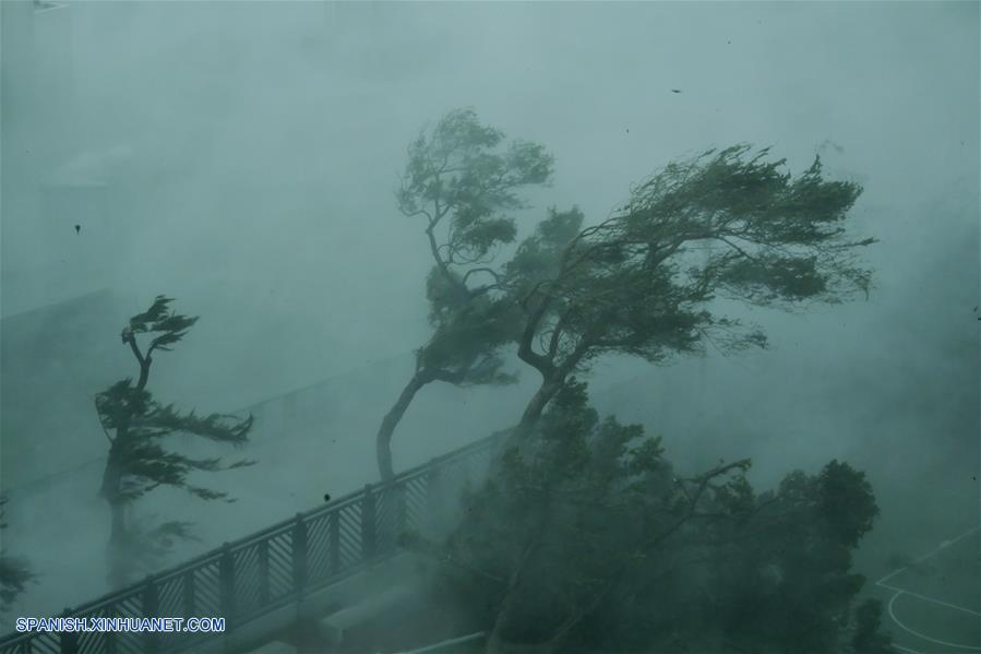 HONG KONG, septiembre 16, 2018 (Xinhua) -- Vista de árboles meciéndose fuertemente a causa del viento, en la costa de Hong Kong, en el sur de China, el 16 de septiembre de 2018. La se?al de huracán No. 10, el nivel más alto de alerta, fue emitida por el Observatorio de Hong Kong a las 9:40 hora local del domingo y fue sustituida por la segunda alerta más alta, la se?al de Vendaval del Sudeste 8, a las 19:40 hora local. (Xinhua/Wang Shen)
