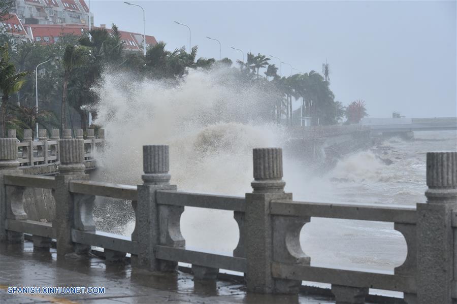 GUANGDONG, septiembre 16, 2018 (Xinhua) -- Las olas del mar rompen cerca de la costa en Zhuhai, provincia de Guangdong, en el sur de China, el 16 de septiembre de 2018. El tifón Mangkhut aterrizó a las 17:00 del domingo en la costa de la ciudad de Jiangmen, en la provincia de Guangdong, sur de China, con vientos de hasta 162 kilómetros por hora, según la estación meteorológica provincial. Todos los vuelos en el aeropuerto de Shenzhen de Guangdong han sido cancelados hasta las 8:00 del lunes. Todos los servicios de autobús de larga distancia en la ciudad fueron suspendidos desde las 18:00 del sábado. (Xinhua/Liang Xu)