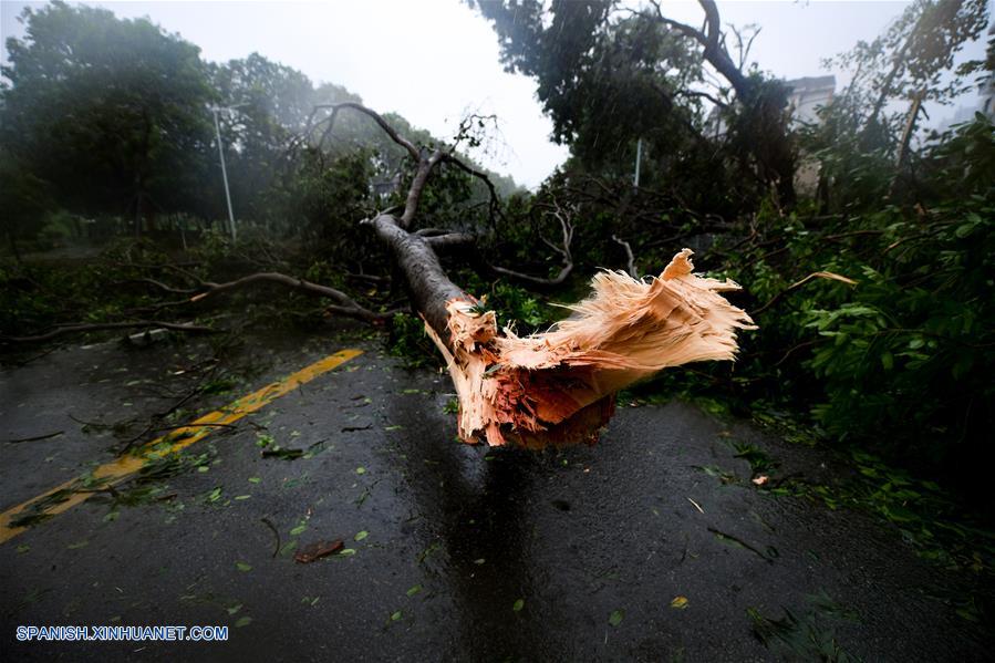 árboles rotos permanecen en el piso debido al tifón Mangkhut, en el distrito de Futian, en Shenzhen, provincia de Guangdong, en el este de China, el 16 de septiembre de 2018. El tifón Mangkhut aterrizó a las 17:00 del domingo en la costa de la ciudad de Jiangmen, en la provincia de Guangdong, sur de China, con vientos de hasta 162 kilómetros por hora, según la estación meteorológica provincial. (Xinhua/Mao Siqian)