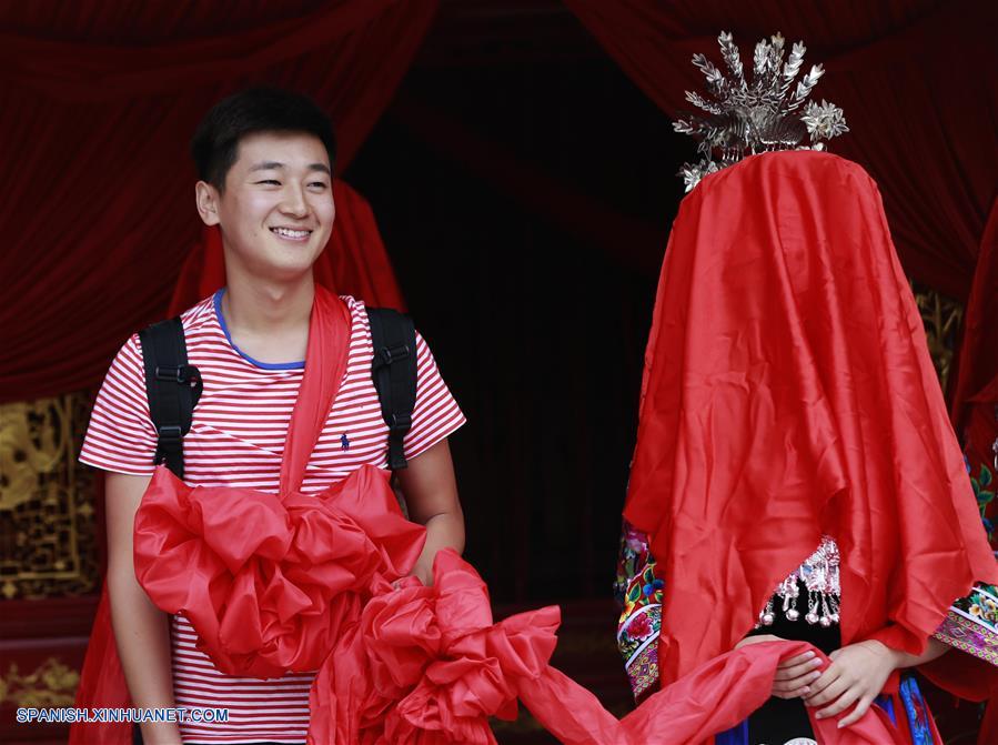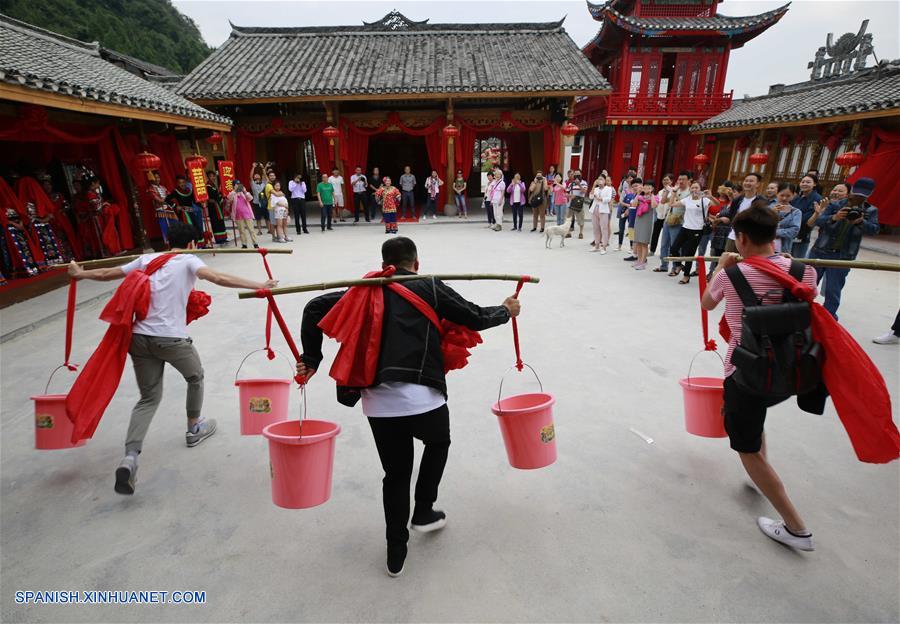 HUNAN, septiembre 16, 2018 (Xinhua) -- Turistas asisten a una actividad folclórica sobre las tradiciones de la boda del grupo étnico Tujia, en el distrito Wulingyuan de Zhangjiajie, provincia de Hunan, en el centro de China, el 16 de septiembre de 2018. (Xinhua/Wu Yongbing)