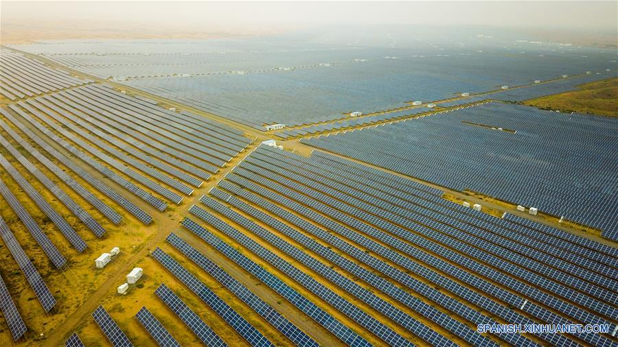 NINGXIA, septiembre 16, 2018 (Xinhua) -- Imagen aérea del 31 de agosto de 2018 de una estación de energía solar en el desierto, en la ciudad de Zhongwei, en la región autónoma Hui de Ningxia, en el noroeste de China. (Xinhua/Guo Xulei)