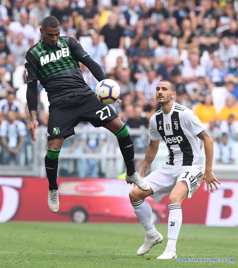 TURIN, septiembre 16, 2018 (Xinhua) -- El jugador Leonardo Bonucci (d), de Juventus, disputa el balón con Prince Boateng, de Sassuolo, durante el partido correspondiente a la Serie A italiana, celebrado en el Estadio Juventus, en Turín, Italia, el 16 de septiembre de 2018. (Xinhua/Alberto Lingria)