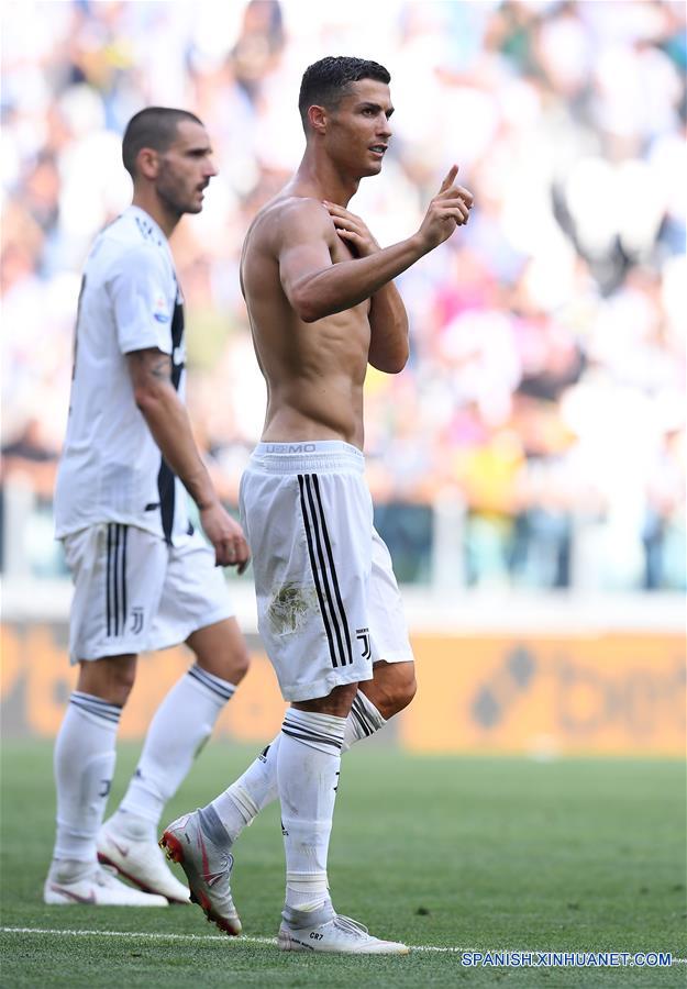 TURIN, septiembre 16, 2018 (Xinhua) -- El jugador Cristiano Ronaldo (d), de Juventus festeja al término del partido correspondiente a la Serie A italiana, ante Sassuolo, celebrado en el Estadio Juventus, en Turín, Italia, el 16 de septiembre de 2018. (Xinhua/Alberto Lingria)