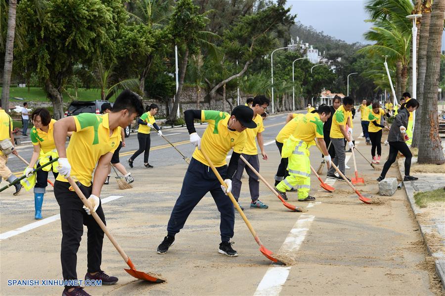 Una compa?ía organiza a sus trabajadores para ayudar a limpiar la basura y la arena en Zhuhai, provincia de Guangdong, en el sur de China, el 17 de septiembre de 2018. El impacto del súper tifón Mangkhut en Zhuhuai está descendiendo gradualmente. Departamentos relacionados se han comprometido con la reconstrucción, y muchas compa?ías y ciudadanos participan voluntariamente en ello. El tránsito, la aduana portuaria, la electricidad y el suministro de agua están en recuperación. (Xinhua/Liang Xu)