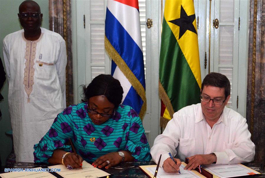LA HABANA, septiembre 17, 2018 (Xinhua) -- El ministro de Relaciones Exteriores de Cuba, Bruno Rodríguez (d), y la ministra de Relaciones Exteriores de Ghana, Shirley Ayorkor Botchwey (i-frente), firman el Acuerdo para Consultas Diplomáticas Regulares entre el Ministerio de Relaciones Exteriores de Cuba y el Ministerio de Relaciones Exteriores e Integración de Ghana, en la sede del Ministerio de Relaciones Exteriores de Cuba, en La Habana, capital de Cuba, el 17 de septiembre de 2018. De acuerdo con información de la prensa local, los ministros de Relaciones Exteriores de Cuba y de Ghana firmaron el lunes un acuerdo para promover y fortalecer a través del diálogo las relaciones bilaterales entre ambos países. (Xinhua/Str)