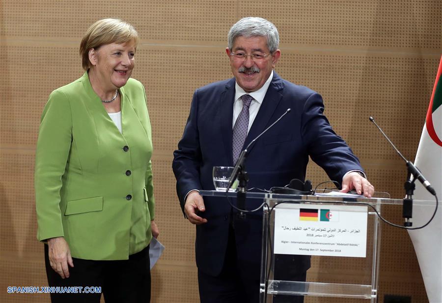 ARGEL, septiembre 17, 2018 (Xinhua) -- La canciller alemana, Angela Merkel (i) y el primer ministro argelino, Ahmed Ouyahia (d), asisten a una conferencia de prensa conjunta en Argel, Argelia, el 17 de septiembre de 2018. De acuerdo con información de la prensa local, la canciller alemana Angela Merkel comenzó su visita a Argelia el lunes con conversaciones con el primer ministro Ahmed Ouyahia, donde discutieron asociación bilateral para combatir la inmigración indocumentada y el terrorismo. (Xinhua/Str)